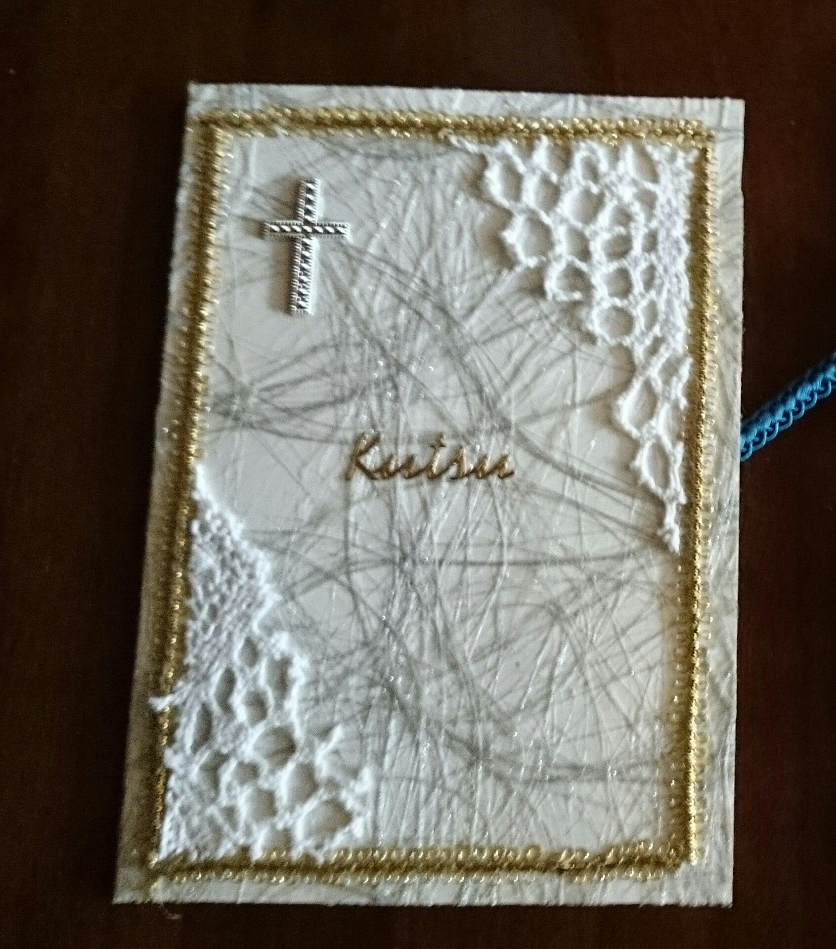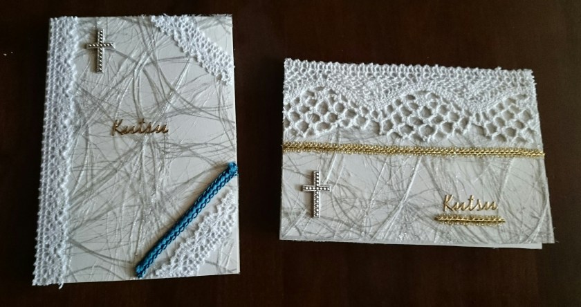 Oikealla puolella olevaan korttiin leikkasin vanhasta pitsinauhasta yläpuolelle koristeen, laitoin kortin puoliväliin kultaisen nauhan ja sitten vasemmalle hopeinen risti ja oikealle kullan värisellä tekstin kutsu. Kutsu on vielä alleviivattu kultaisella nauhalla. Omasta mielestäni tämä kortti on ihan nätti. Vaikkei värejä hirveästi olekaan, niin yläosan pitsinauha antaa kutsukortille näyttävyyttä.