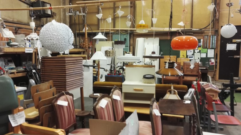 Tänään sitten oli aikaa ja päätin kuin päätinkin katsastaa Paavolan kirpputorin. Yllätyin positiivisesti. Ensin kun menin ulko-ovesta sisään, ajattelin, että täällähän on hirveän kylmä ja ettei ole vuokrattavia pöytiäkään. Huonekaluja sen sijaan oli siellä täällä. Tarkempi huonekalujen tarkastelu saikin sitten ajattelemaan, että kyseessä on oikea aarreaitta, jos osaa vähänkään entisöidä huonekaluja. Varsinkin valaisimet olivat tosi kivoja.