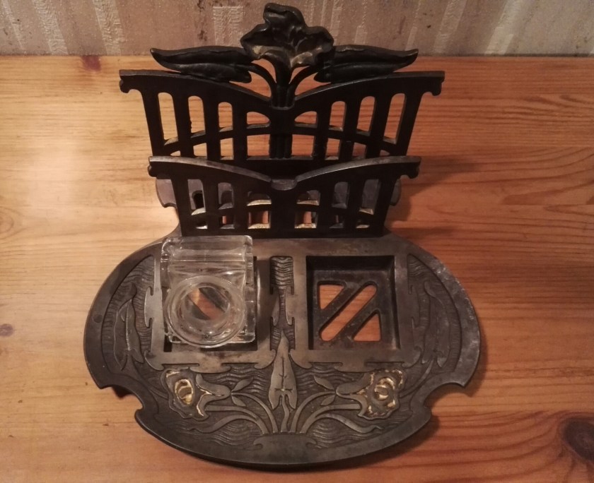 Vanha metallinen mustekynäteline. Toinen lasikuppi on mennyt rikki, joten toivoisin tähän löytäväni vielä ehyelle parin. Puhdistettuani telineen totesin, että joissakin kohdissa on messinki- tai vastaava pinnoite. Kukissa on kultausta. Mustekynätelineen iästä minulla ei ole mitään käsitystä, kuten ei myöskään mahdollisesta arvosta. Itse maksoin telineestä 15 euroa.