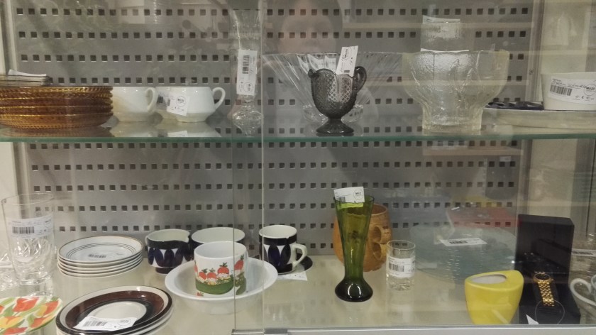 Kirpputorilla oli tietenkin myös normaalit vuokrattavat pöytätilat. Pöydissä oli samanlaista tavaraa kuin muillakin kirpputoreilla, siis kaikkea mahdollista. Kirpputorilla oli omat vitriinikaapit arvotavaralle. Vitriinikaappi oli täynnä tavanomaista Arabiaa, Iittalaa, Humppilaa jne. Arvolasilla ja -posliinilla oli tietenkin arvokas hintakin. Jotenkin itsestäni vain tuntuu siltä, että jos kirpputorilla myy arvotavaraa normaaliin markkinahintaan, ei monikaan niitä osta. Lähinnä keräilijöille vitriinikaapit voivat olla aarreaitta.