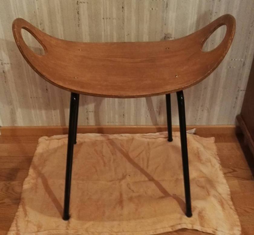 Etsin netistä tietoa jakkarasta. Kyse on Olof Kettusen J.Merivaara Oy:lle tekemä jakkara 1950-luvulta. Jakkara on muottiin puristettua tiikkivaneria metallijalustalla. Leveys on 52,5 cm, istuinkorkeus 41 cm ja korkeus 53 cm. Bukowskis-huutokaupassa kyseinen jakkara on myyty hintaan 242 € (https://www.bukowskis.com/fi/lots/793438-jakkara-olof-kettunen-j-merivaara-oy-1950-luku).