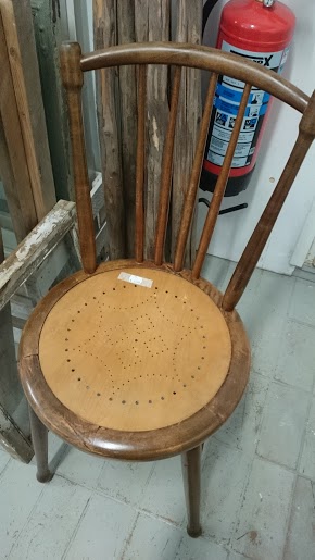 Tällainen vanha tuoli löytyi myös Wanhasta Meijeristä. Hieman erilainen muotoilu, jalat olivat ehjät, samoin istuinosa ja selkänoja. Tämän kun kevyesti petsaa tai lakkaa, saa hienon tuolin itselleen. Harmi, että niitä oli vain yksi kappale.