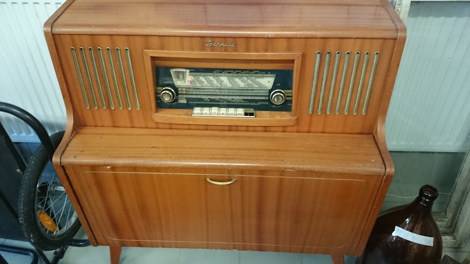 Tällainen oli kirpputorin etuosassa, lähellä kassaa. Todella vanha radio alakaapilla. Radiossa oli muuten äänet päällä ja ne kuuluivat hyvin. Paremmin kuin monessa nykyajan vempeleessä. Ja niinkuin kuvasta näkyy, ikäisekseen se on erittäin hyväkuntoinen.