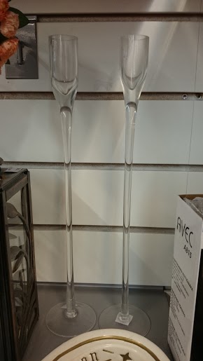 Hienot lasiset kynttilänjalat erityisen pitkillä jaloilla. Sopivat parhaiten koriste-esineiksi hyllyyn, sillä ohuen jalan vuoksi kynttilänjalat ovat melko heppoisia ja kaatuvat helposti. Ainakaan palavia kynttilöitä ei kannata jalkoihin laittaa, ettei tulipalo pääse yllättämään. Muistaakseni yhden kynttilänjalan hinta oli siinä 2-3 euron tienoilla.