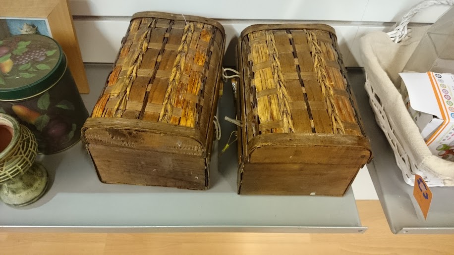 Tässä on kaksi puista rasiaa. Päällisin puolin ne näyttävät siltä mitä ovatkin, vanhoilta säilytysrasioilta. Rasiat ovat kuitenkin ehyet ja sisäpuolelta siistit. Sopisivat talonpoikaiseen sisustukseen. Eikä näitä esineitä taatusti ole joka talossa. Paljon olen kirpputoreja kiertänyt ja ensimmäisen kerran osui tällaiset yksilöt kohdalle. Hinta taisi olla jotain 5-6 euron paikkeilla kappaleelta.