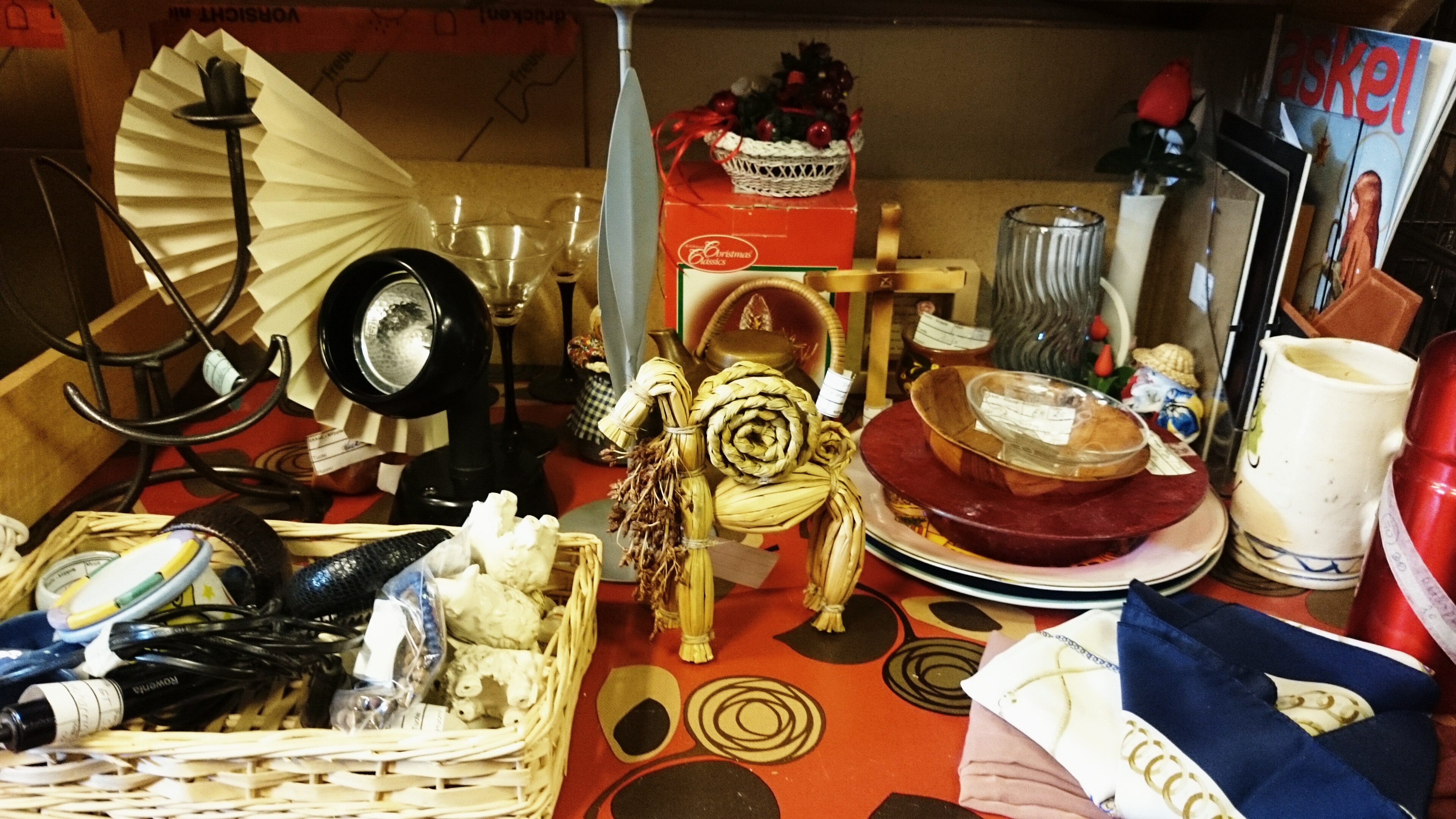 Tässä yksi esimerkki myyntipöydästä. On se kumma, miten näin jälkeenpäin kuvasta näkee paremmin kuin paikan päällä, mitä pöytä oikein sisältää. Melko sekalaista tavaraa tässä pöydässä, mutta ei liian täyteen ahdettu pöytä kuitenkaan. Tällaisesta pöydästä tekee parhaiten löytöjä. Aivan liian paljon on niitä pöytiä, jotka on tungettu täyteen tavaraa ja moneen kerrokseen. Ensinnäkin sellaisesta ei löydä mitään ja toiseksi jos penkoo pöytää, on kaikki pöydässä välittömästi sekaisin.