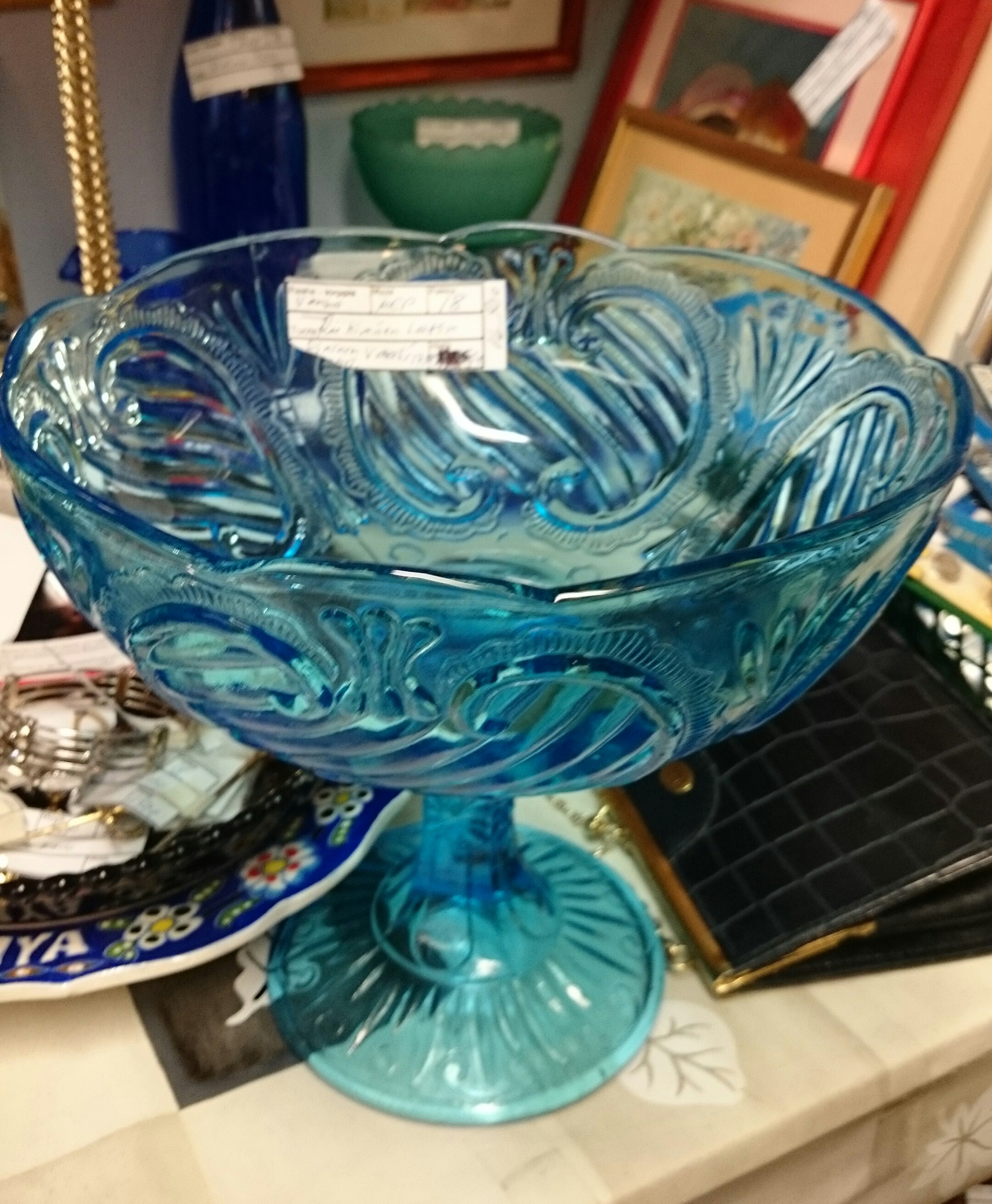 Lopulta bongasin myös tällaisen kulhon, jota kaupattiin Riihimäen lasina. Tihrustin aikani puhelimen näytöstä netissä vastaavanlaisia Riihimäen lasin kulhoja, enkä niitä löytänyt. Harmi. Todella kaunis ja isokokoinen jalallinen kulho, mutta ei huvittanut maksaa 16,50 € siitä, kun ei tiennyt onko kyse edes Riihimäen lasista. Kulhossa ei ollut myöskään mitään leimaa, mutta sehän ei kerro vielä mitään, kun ei kaikissa muissakaan Riihimäen lasin tuotteissa ole. Kyseinen tavara olisi sisustuksellisesti sopinut niin älyttömän hyvin omaan olohuoneeseen.