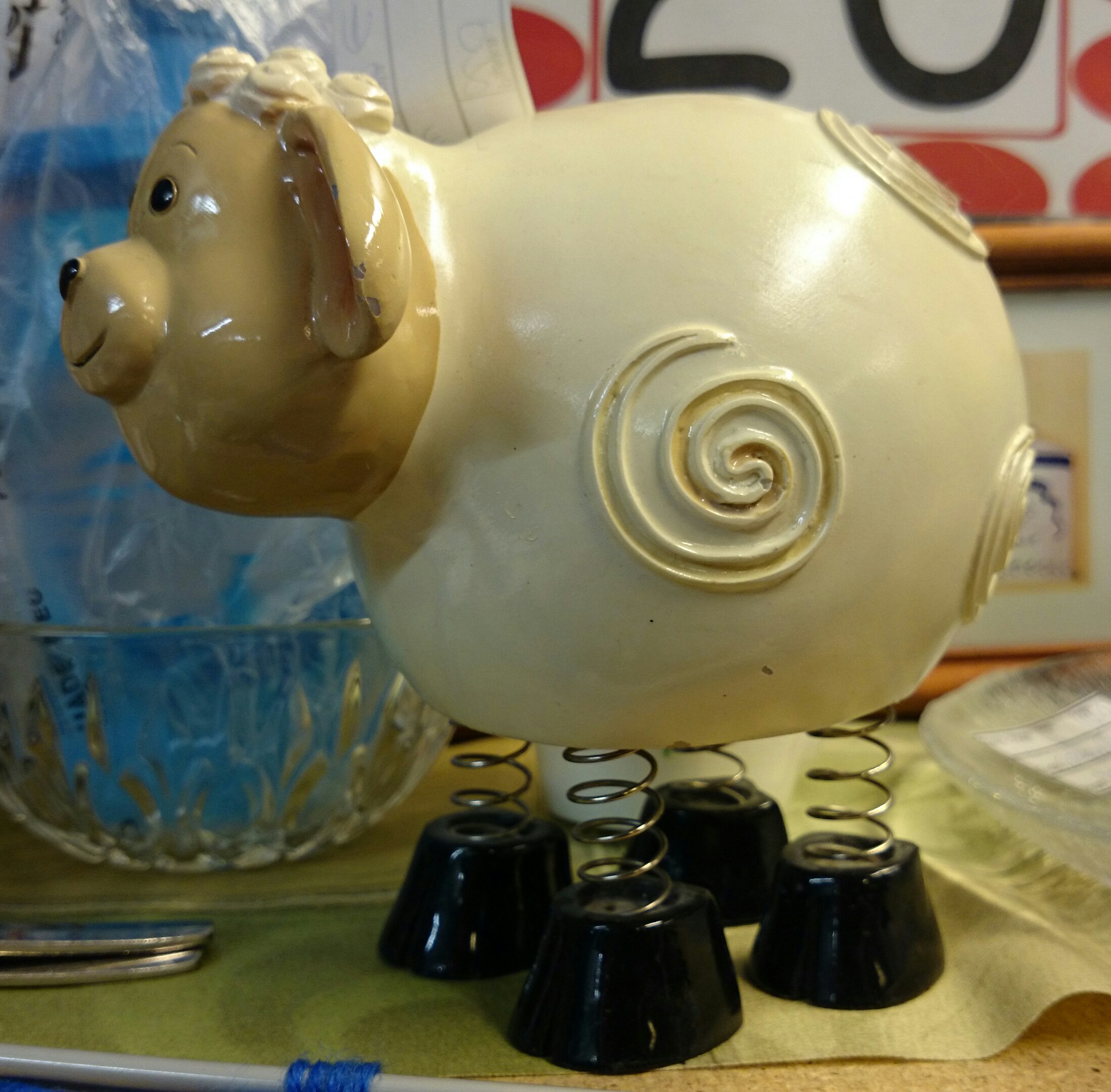 Tämä säästöpossu iski ihan vahingossa silmään. Rumahan se on tai ainakin hyvin mitäänsanomattoman näköinen. Mutta jotakin kivaa tässä silti on. En ensinnäkään ole ennen nähnyt säästöpossua, jossa olisi tuollaiset jalat. Vaaleampi väri on ihan kiva, mutta miksi pää on sitten ripulinkakan väristä?