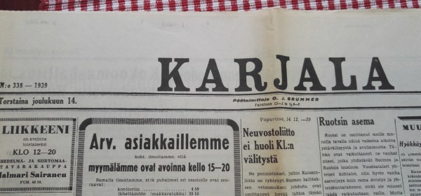 Tänään haalimani jutut eivät ole kirpputorilta ostettuja, eivätkä esineitäkään. Kyseessä ovat isäni säilyttämä vanha sanomalehti ja äitini hankkima materiaali Suomalaisen Kirjallisuuden Seuran arkistosta. Varsinkin isäni